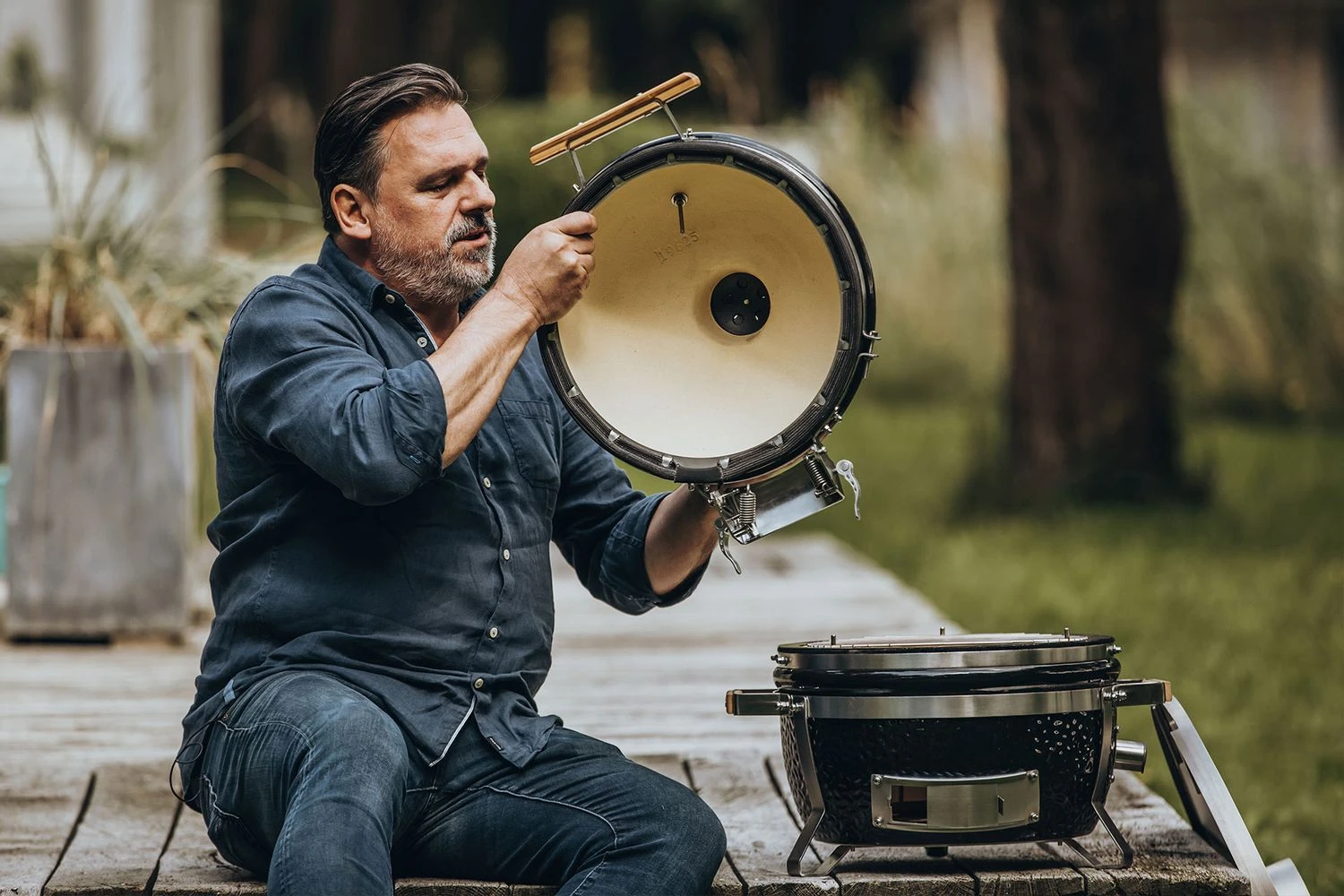 Der mulitfunktionale Holzkohlegrill aus besonders hitzebeständiger Keramik bietet mit seinem großen Spektrum an Garmöglichkeiten die perfekte Outdoorküche für unterwegs. Der Monolith-begeisterte Sternekoch Tim Mälzer ist daher besonders von der vielseitigen Nutzung des kleinen Keramikgrills begeistert. Der Deckel ist besonders leicht abnehmbar, so dass eine optional erhältliche Feuerplatte montiert werden kann. Dadurch ergibt sich die Möglichkeit auch Pfannengerichte, Fisch und Gemüse mit Leichtigkeit perfekt zu garen.