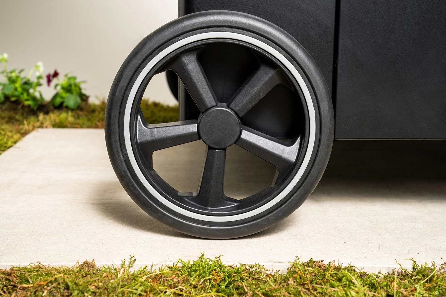 Der geräumige und durchdachte Unterbau mit leichtgängigen Rädern und einer Front-Tür mit Magnetverschluss kann eine Gasflasche aufnehmen und bietet zudem noch Platz für Zubehör. Die Seitentische können bequem abgeklappt und der Grill damit platzsparend verstaut werden. Weiterhin sind an den Seitentischen praktische Besteckhaken zu finden. Mit den höhenverstellbaren Standfüßen passen Sie die Arbeitshöhe bequem jedem Untergrund an.