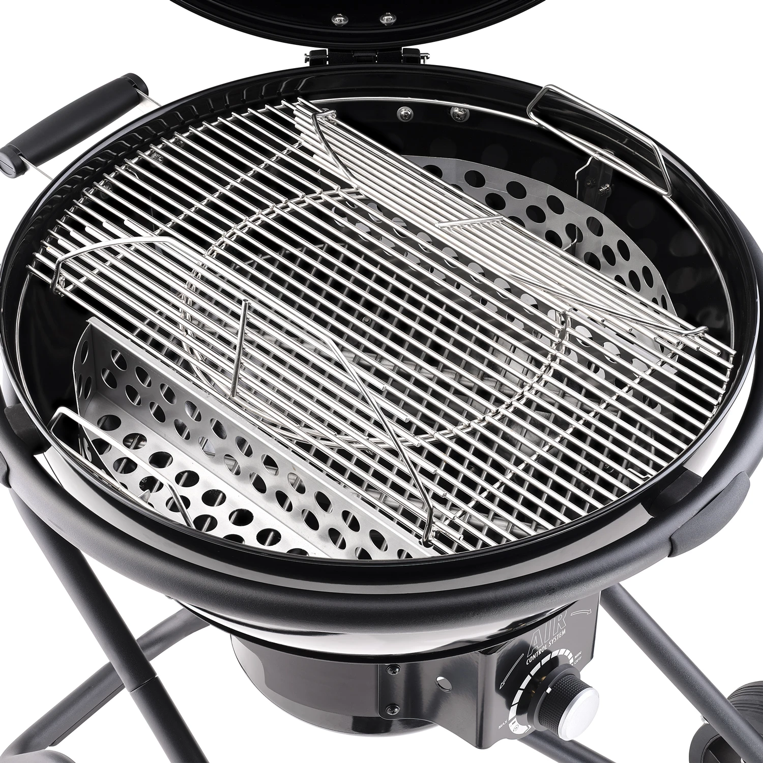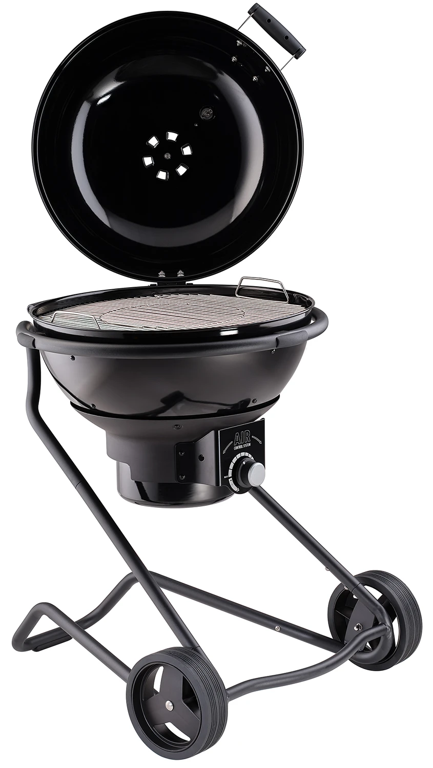 Das patentierte AIR Control System lässt sich im wahrsten Sinne des Wortes im Handumdrehen steuern. Hierfür befindet sich unterhalb der Grillkugel auf Höhe des Aschebehälters ein großer Drehknopf, mit dem sich die Menge der Zuluft ganz einfach regulieren lässt. Zusammen mit dem mit dem gut ablesbaren Deckelthermometer können sie die Temperatur im Inneren immer exakt den Bedürfnisse anpassen.